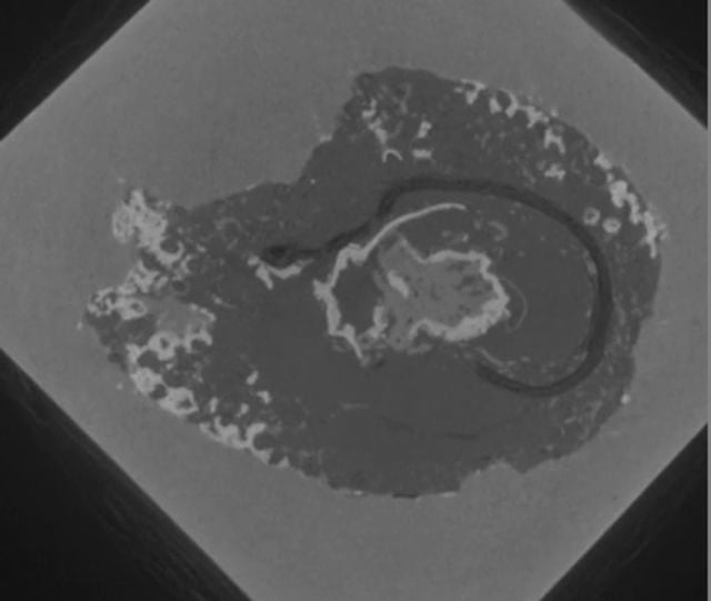 A sequence showing the CT scan of a new fossil pteridosperm ovule (Stephanospermum braidwoodensis FMNH P30420) from Mazon Creek in Illinois as described by Alan Spencer, Jason Hilton and Mark Sutton in the journal Review of Palaeobotany and Palynology.